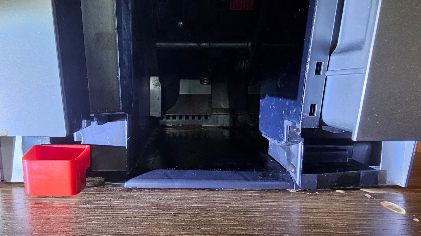Das Wasser scheint am Ende der Schiene wo der Wassertank läuft auszutreten, und läuft dann unter die Maschine. Das Wasser ist klar.