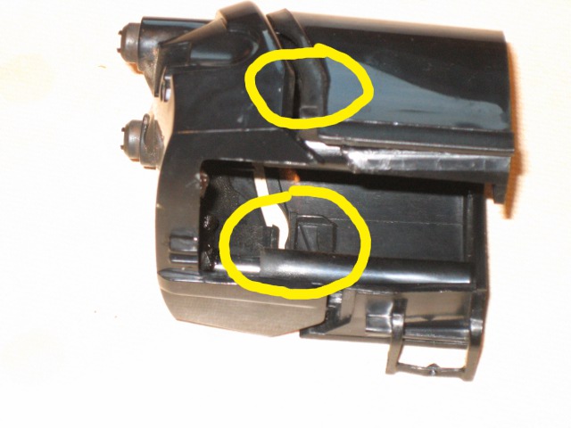 • Den Auslauf musst Du nach oben aus seiner Führung ziehen, dazu die Lasche, die gegen diese Leiste mit Rasten drückt vorsichtig nach außen hebeln. ACHTUNG, bricht leicht.