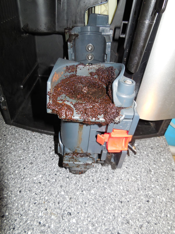 Nun ja ich habe nicht gewartet bis die nächste Reinigung ansteht, sondern habe gestern schon einmal hinein gesehen. Tja was soll ich sagen, ich war entsetzt. Die Brühgruppe war total mit nassen Kaffeesatz überzogen.