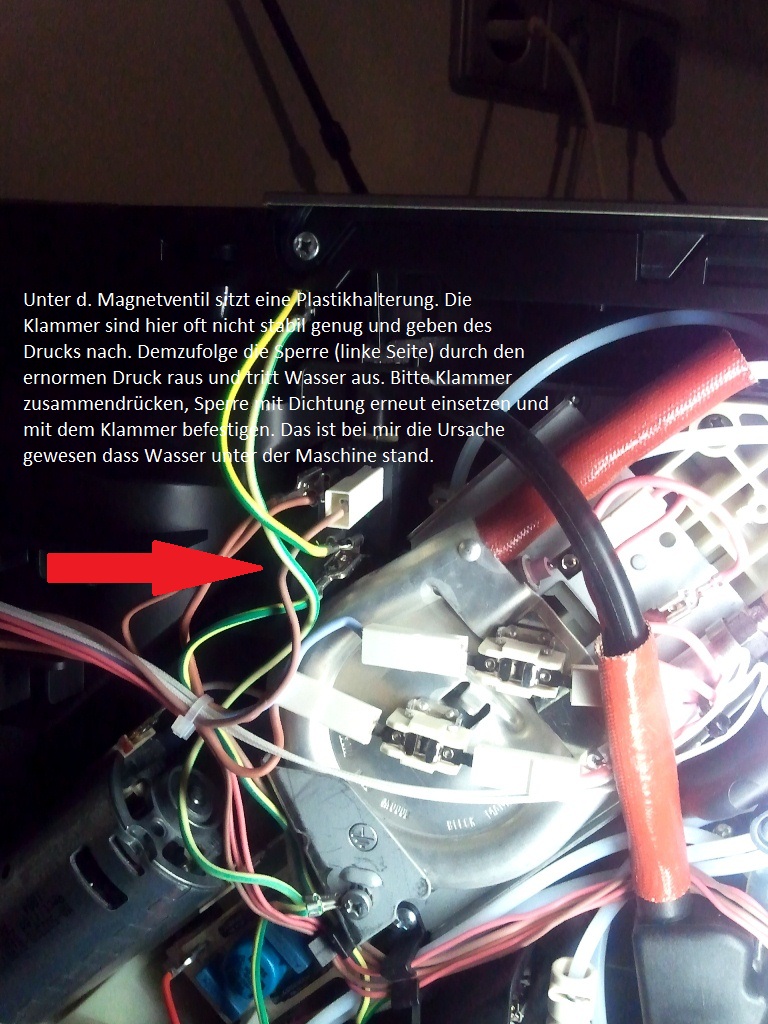nach langer Zeit habe ich paar Bilder erstellt bzgl. der Demontage. Für den Wasseraustritt (Wasserlache unter der Maschine) war eine Klemme verantwortlich unterhalb der Magnetvile. Alles beschrieben auf dem Bild "Manetventil"