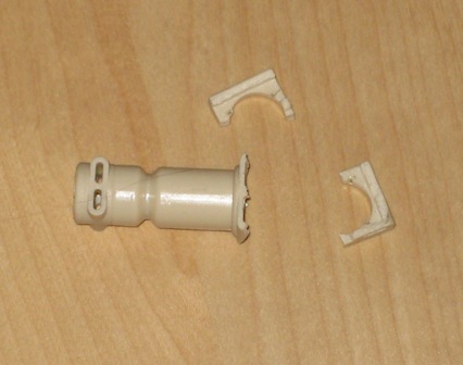 Wie auch immer so was passieren kann: Die Halterung, die den Druckschlauch von der Pumpe kommend am Thermoblock fixiert, ist im Bereich der großen Sicherungsklammer zerbrochen.