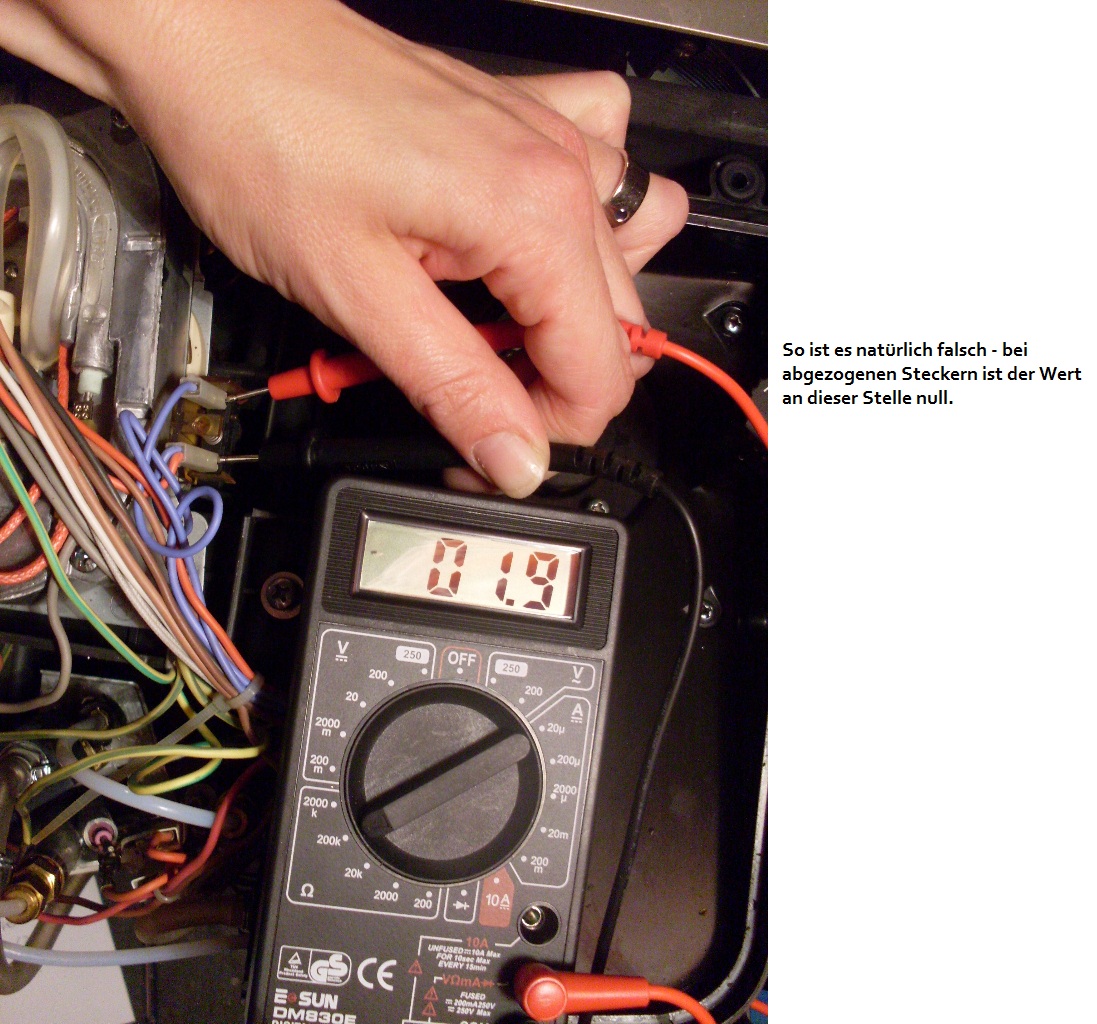 • Der TB ist defekt. Die Spuren am Dampferhitzer sind nach dem Foto schwer zu beurteilen, sehe ich aber als nicht relevant an. Die braune Verfärbung am Stecker kommt im Laufe der Zeit durch die Hitze, ist auch nicht relevant. Der 3. Kontakt am Magnetventil ist für den Schutzleiter, falls er denn angeschlossen wird.