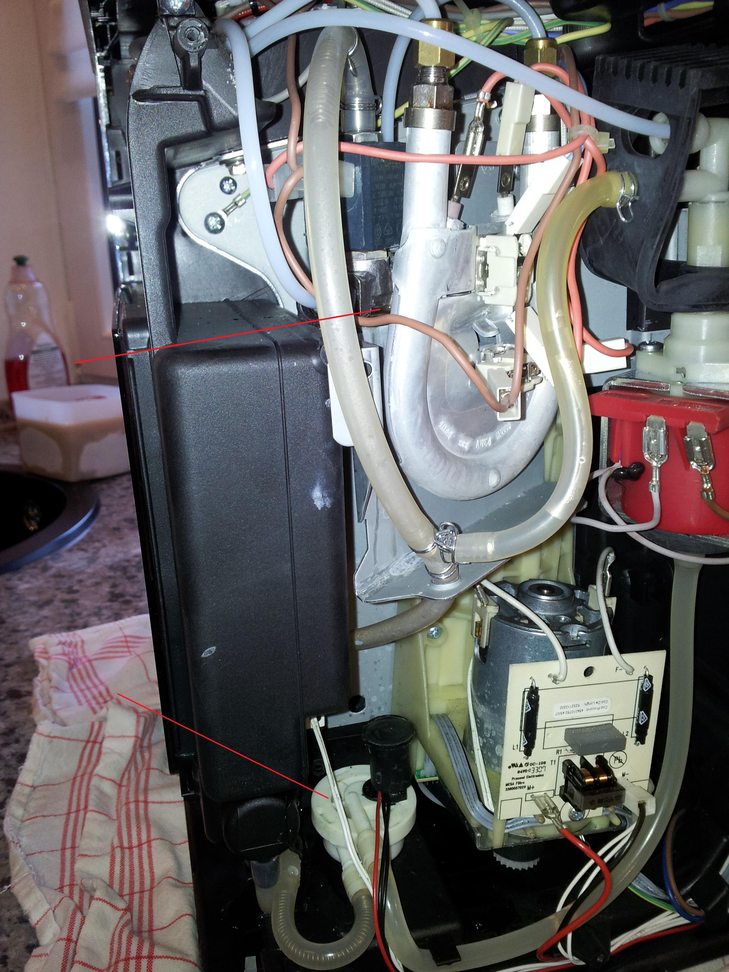 <P>Meine Primadonna leckt seit ein paar Wochen. Unter dem Automaten befindet sich nach dem Gebrauch immer Wasser. Hab mich jetzt mal getraut, die Rückwand und das Seitenteil abzunehmen. Man konnte sehen, dass auf dem runden weißen Flowmeter Wasser war. Ich dachte, das wärs. Aber nachdem ich das trockengelegt hab, zeigte sich, dass das Wasser von oben über das Blech runtertropft. Hinter der Heizung ist da das Magnetventil. und dort saut es. Allerdings nur wenn ich Milchschaum, bzw Dampf rauslasse. Hab mal Fotos davon gemacht. Kann mir jemand sagen, ob das leicht zu reparieren ist, oder ob ich besser zu nem Händler gehe??? Vielen dank jetzt schon!!!!</P>