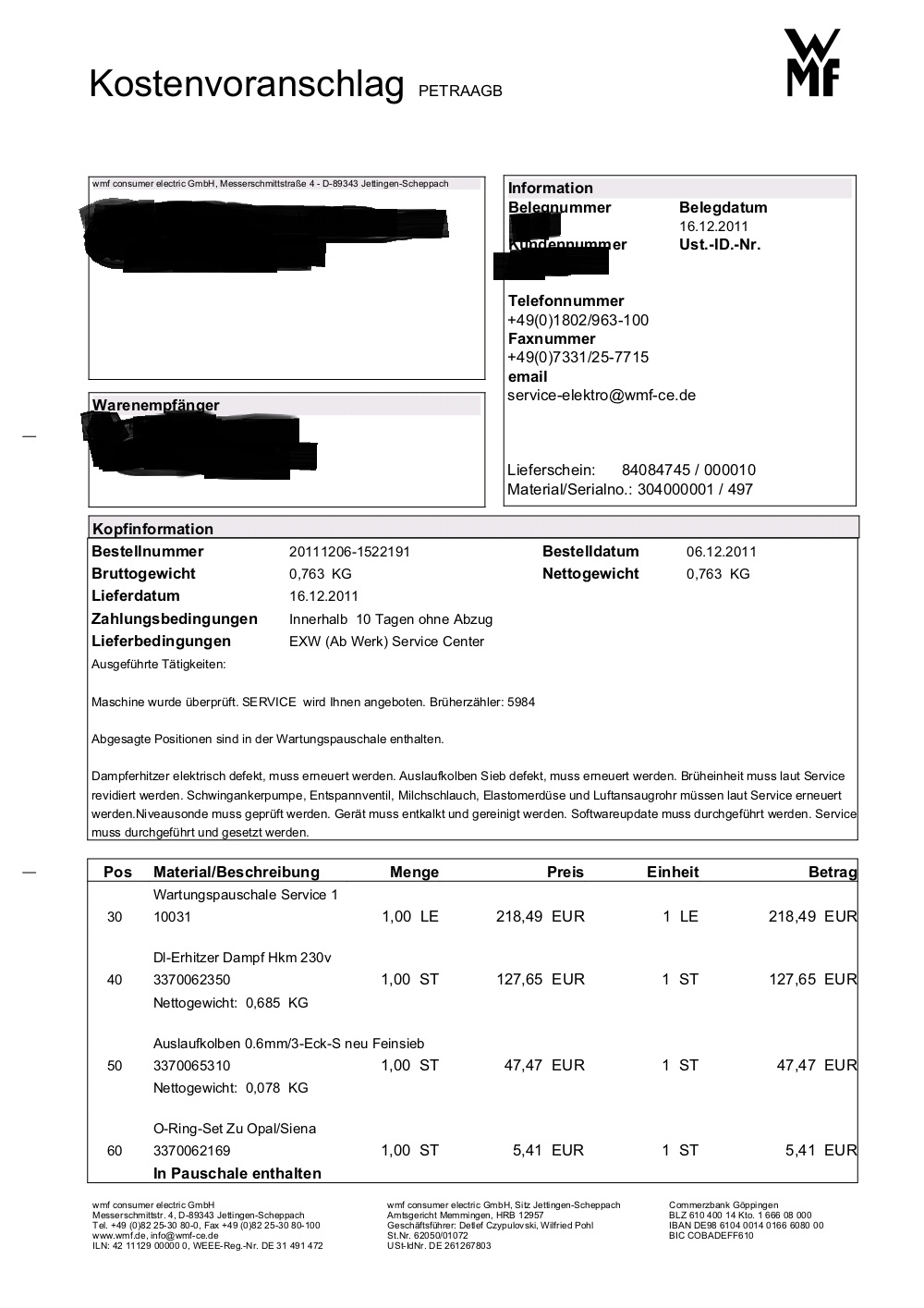 Unsere WMF 800 war leider aussehalb der Garantiezeit defekt. Daher habe ich das Gerät beim WMF-Service defekt