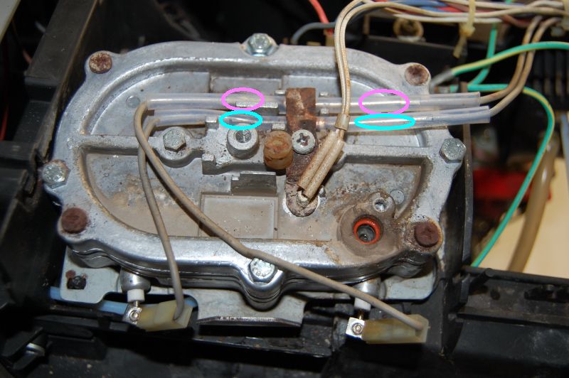 Grün = Heizungsanschlüsse, Blau = Thermosensor, Lila = 2 Temperatursicherungen.