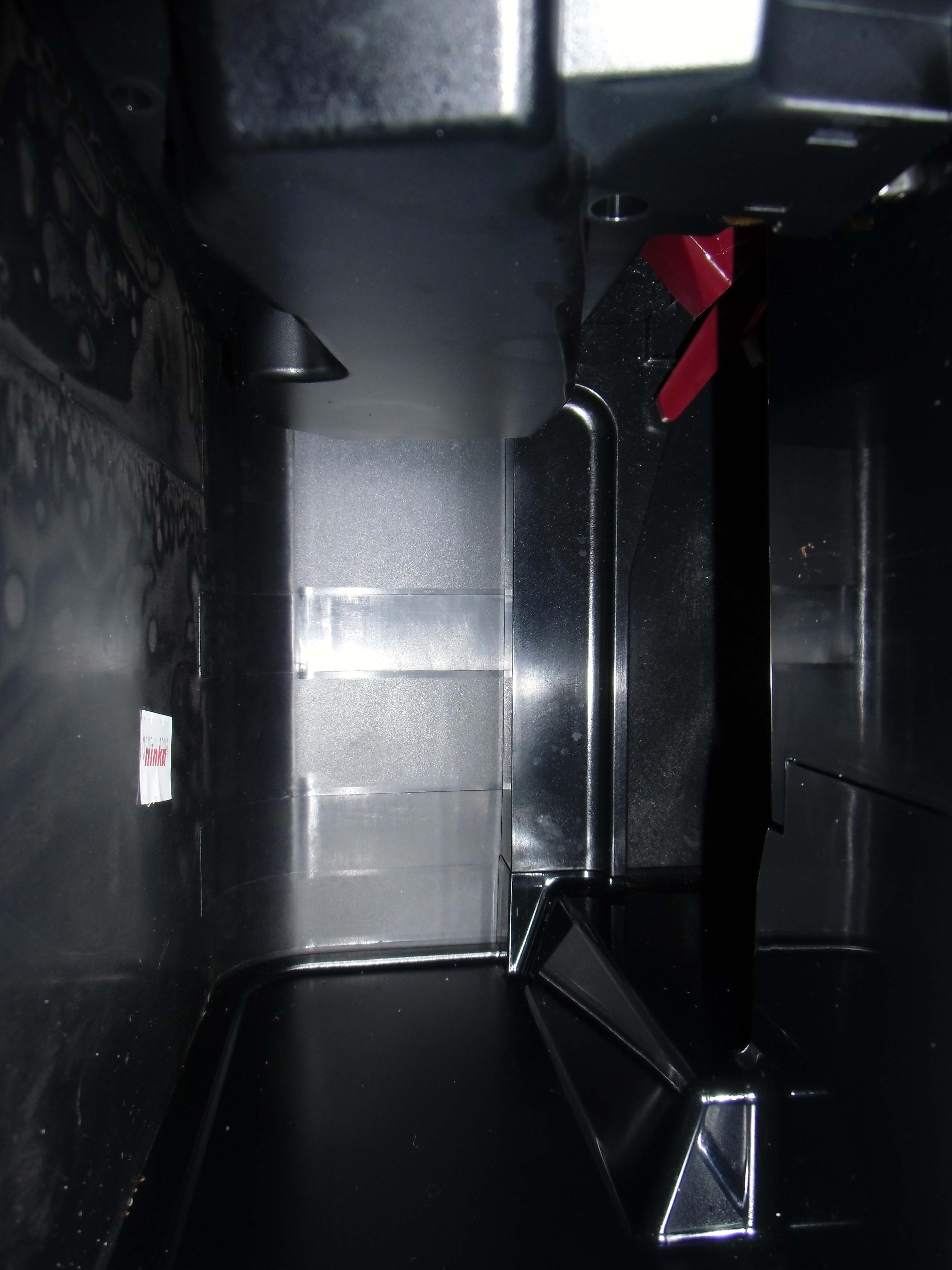 -Hier das vorderseitige Plastikteil von der Bodenplatte wegdrücken, irgendwann lässt sich der Boden heben. -