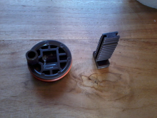 Beide Teile (Zahnlauf und Kolben) sind durch eine Steckverbindung verbunden. Ich habe beide Teile zunächst nur gesteckt und wieder eingebaut, leider hat sich beides dann im Probebetrieb wieder gelöst ( Maschine war schon wieder komplett zusammengebaut