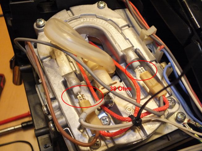 Ich habe das Gehäuse der CS5000 auseinander genommen und den Widerstand am Thermoblock gemessen (siehe Bild). Zwischen den beiden rot markierten Anschlüssen messe ich 38 Ohm. Nachdem was ich bisher in diesem Forum gelesen habe, müsste bei einem defekten Thermoblock ca. 80 Ohm anstehen.