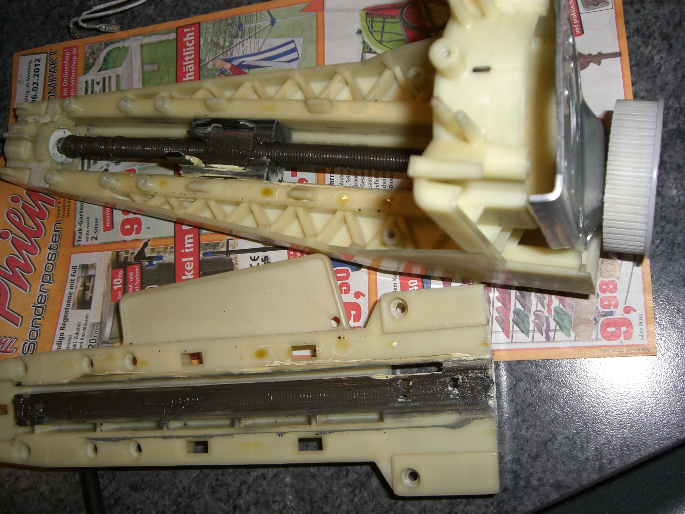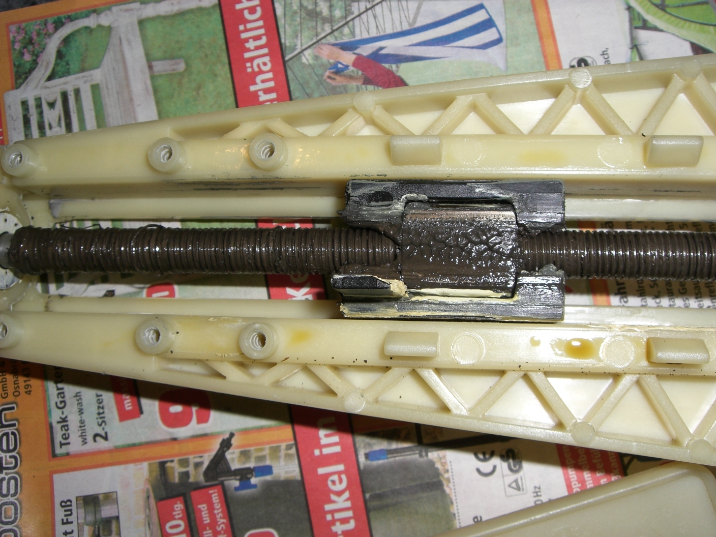 Kommt mir fast so vor, als ob das zuviel Fett war und das Messinggewinde im Schlitten zerstört hat.