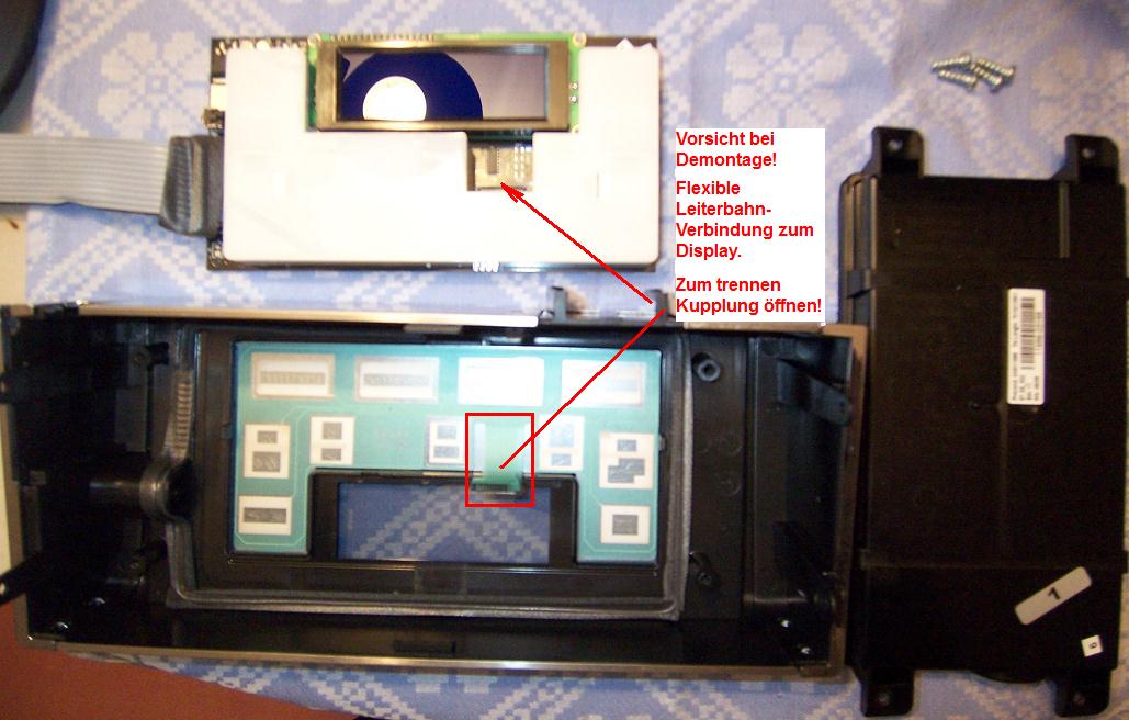 Vorsicht beim trennen von Display-Platine und Gehäusefront. Das Display ist mit der Glasscheibe des Bedienteils über eine flexible Leiterbahn verbunden, die erst durch öffnen der Steckfassung getrennt werden muss. Bei unvorsichtigen Vorgehen könnte die Leiterbahn abgerissen werden!