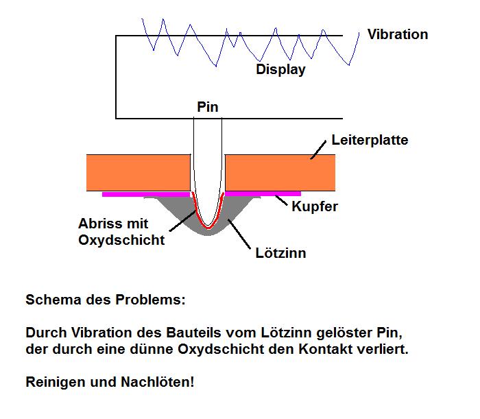 Die Ursache für die zunehmenden Displayfehler sind meines Erachtens in der Pumpe zu finden. Durch den in der Pumpe arbeitenden Stößel entstehen starke Vibrationen, welche die Lötstellen des Displays ständig durchschütteln und dadurch brüchig werden lassen. Durch oxydation des gelösten Anschlusses im Lötpunkt, kommt es dann zum Ausfall von Zeilen oder Spalten in der Matrix (ähnlich kalten Lötstellen). Mit bloßem Auge ist an den Lötstellen nichts zu sehen. Durch nachlöten aller Display-Lötpunkte sind nun alle Displayfehler beseitigt! Alles in allem eine Stunde Arbeit. Wichtig ist ein fachgerechtes Löten mit einem guten Elektronik-Lot und einem geeigneten Flußmittel. Im besten Fall mit einer Lötstation löten! Das originale-Lot fließt sehr schlecht! Unter Umständen Lot absaugen, Pins mit Glasradierer vom Oxyd befreien und mit gutem Lot neu verlöten.