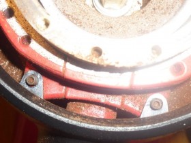 Hier sieht man die beiden Madenschrauben, die die vordere Abdeckung halten. Raus damit und die Abdeckung fällt nach vorne.