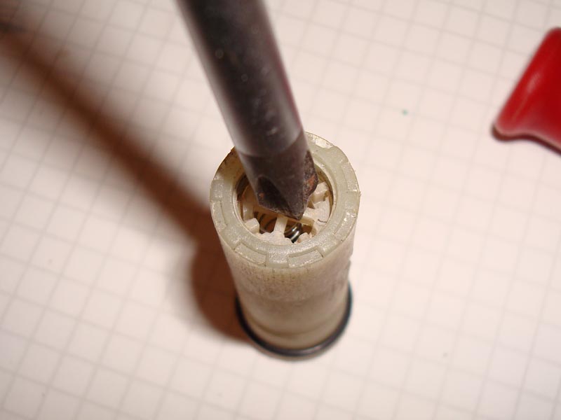Das Innere Kunststoffelement ist mit einem Bajonettverschluß zusammengehalten . .dann offenbaren sich bereits Großteile der Pumpe. . .