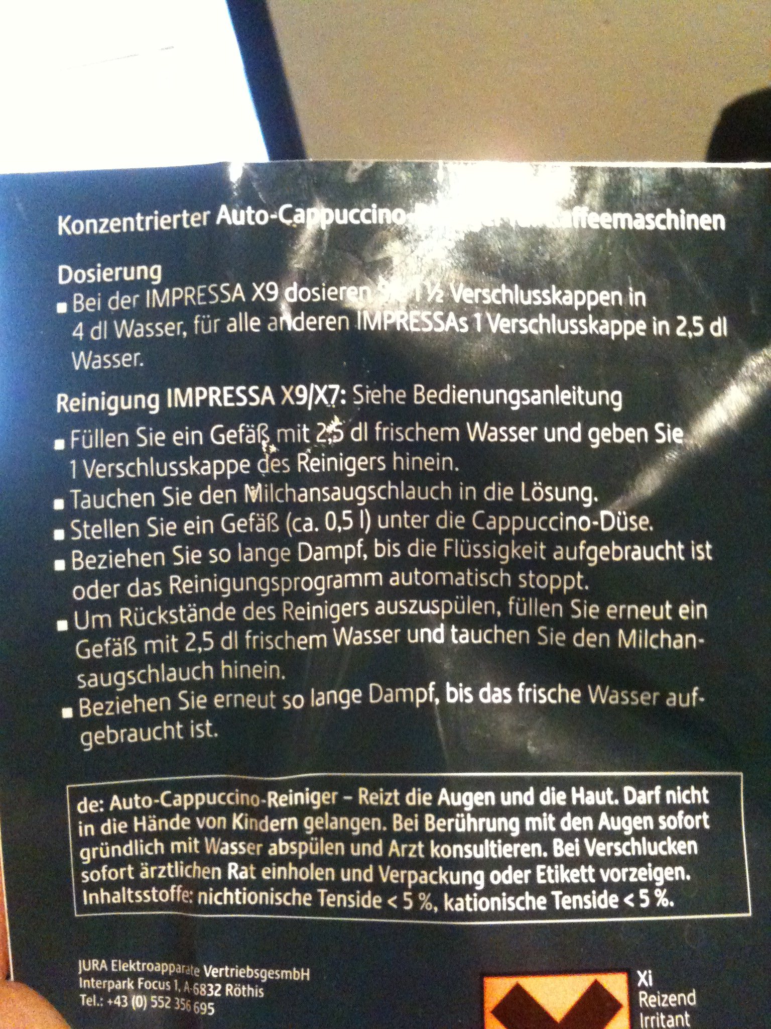 Weiterhin bezog ich meine Kaffee´s (ca. 2 Tage lang) dann entschied ich mich den Entkalkungszyklus zu starten. Blöderweise den JURA Milchreiniger angemischt und Entkalkungszyklus an. Und da verstopfte die Maschine mittendrinn. Nicht einmal ein halber Liter kam raus. Und aus war es.