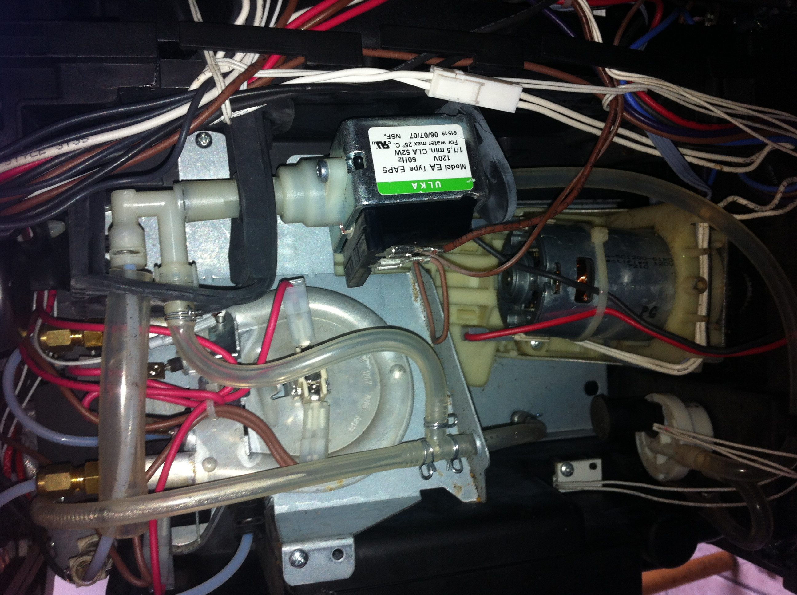 • Das Wasser kommt entweder aus dem Ablauf des Solenoidventils oder der Wasserpumpe. Mach die hintere Verkleidung ab und schau aus welchem der Schlaeuche das Wasser kommt.