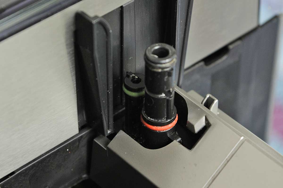 Auf dem ersten Bild sieht man, daß die besagte Rille voll von eingetrockneter Milch ist. Übrigens hängt eh alles voll von getrockneten Milchresten. Auf dem zweiten Bild sieht man vom schwarzen Dichtungsring einen Fetzen davonhängen. Also brauchst du dich nicht zu wundern, daß da kein Milchschaum mehr produziert wird. Ich würde dir auf alle Fälle eine neue Kupplung empfehlen und wie Fred schon gesagt hat, vorher mal die Maschine öffnen und nach Undichtigkeiten Ausschau halten.