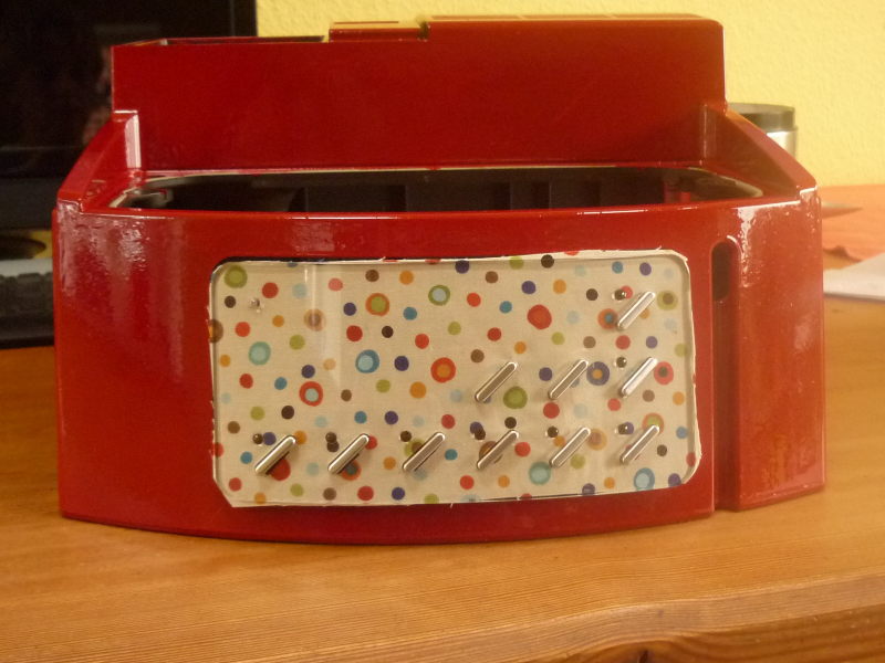 Die schwarze Folie ist wirklich sehr dünn. Zum Testen habe ich mal ein Stoffstück genommen und die Tasteneinschnitte markiert. Dann verschiedene Variationen von Knopflöchern getestet. Als Problem könnte sich die Dicke des Riegels des Knopflochs erweisen... Vielleicht kann ich das doch nicht so machen. Um es auszuprobieren, muss ich auch die Löcher für die Leuchten einschneiden. Einen passenden Stanzer habe ich in meinem Fundus noch nicht aufgetan. Aber da finde ich sicher noch was. :nicken:
