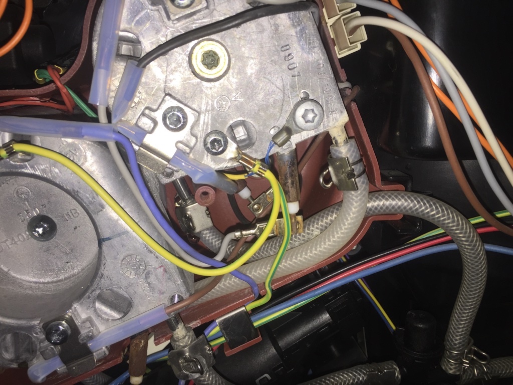 Den Wärmetauscher habe ich dann auch noch ausgebaut und von den Kalkspuren befreit. Beide Leitungen sind frei.