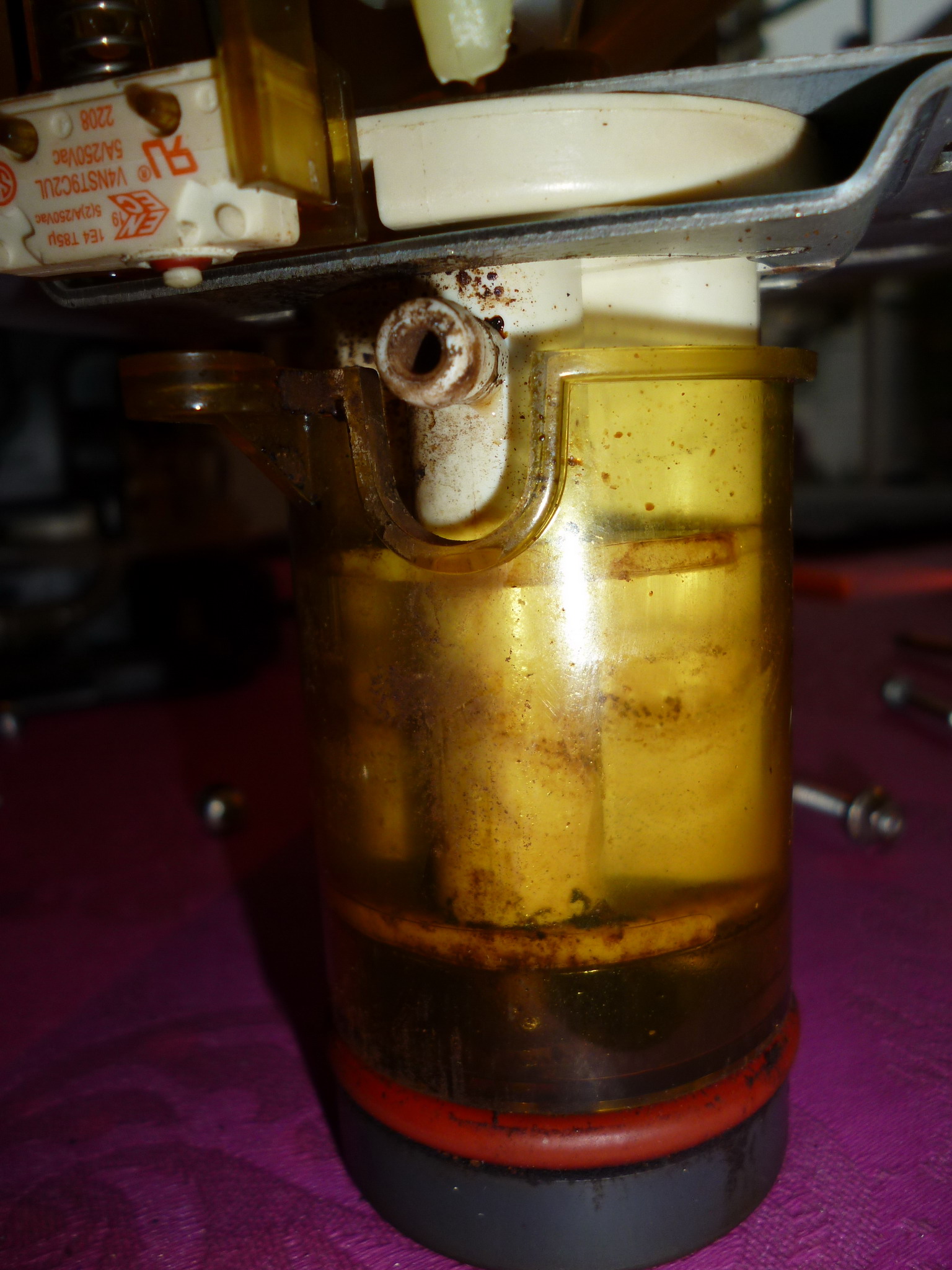 • Wenn Wasser im gelben Becher ist, KANN es ein verstopfter schwarzer Gummischlauch sein. Aber es MUSS ein defekter O-Ring im oberen Brühkolben sein. D.h. Du musst den oBK zerlegen und die O-Ringe tauschen.