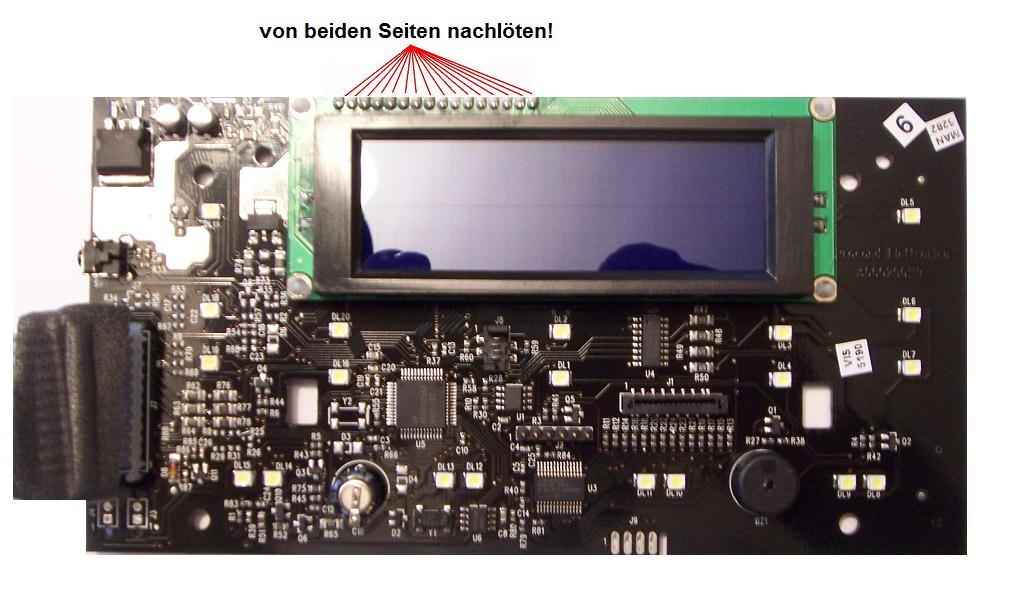 Die Ursache für die zunehmenden Displayfehler sind meines Erachtens in der Pumpe zu finden. Durch den in der Pumpe arbeitenden Stößel entstehen starke Vibrationen, welche die Lötstellen des Displays ständig durchschütteln und dadurch brüchig werden lassen. Durch oxydation des gelösten Anschlusses im Lötpunkt, kommt es dann zum Ausfall von Zeilen oder Spalten in der Matrix (ähnlich kalten Lötstellen). Mit bloßem Auge ist an den Lötstellen nichts zu sehen. Durch nachlöten aller Display-Lötpunkte sind nun alle Displayfehler beseitigt! Alles in allem eine Stunde Arbeit. Wichtig ist ein fachgerechtes Löten mit einem guten Elektronik-Lot und einem geeigneten Flußmittel. Im besten Fall mit einer Lötstation löten! Das originale-Lot fließt sehr schlecht! Unter Umständen Lot absaugen, Pins mit Glasradierer vom Oxyd befreien und mit gutem Lot neu verlöten.