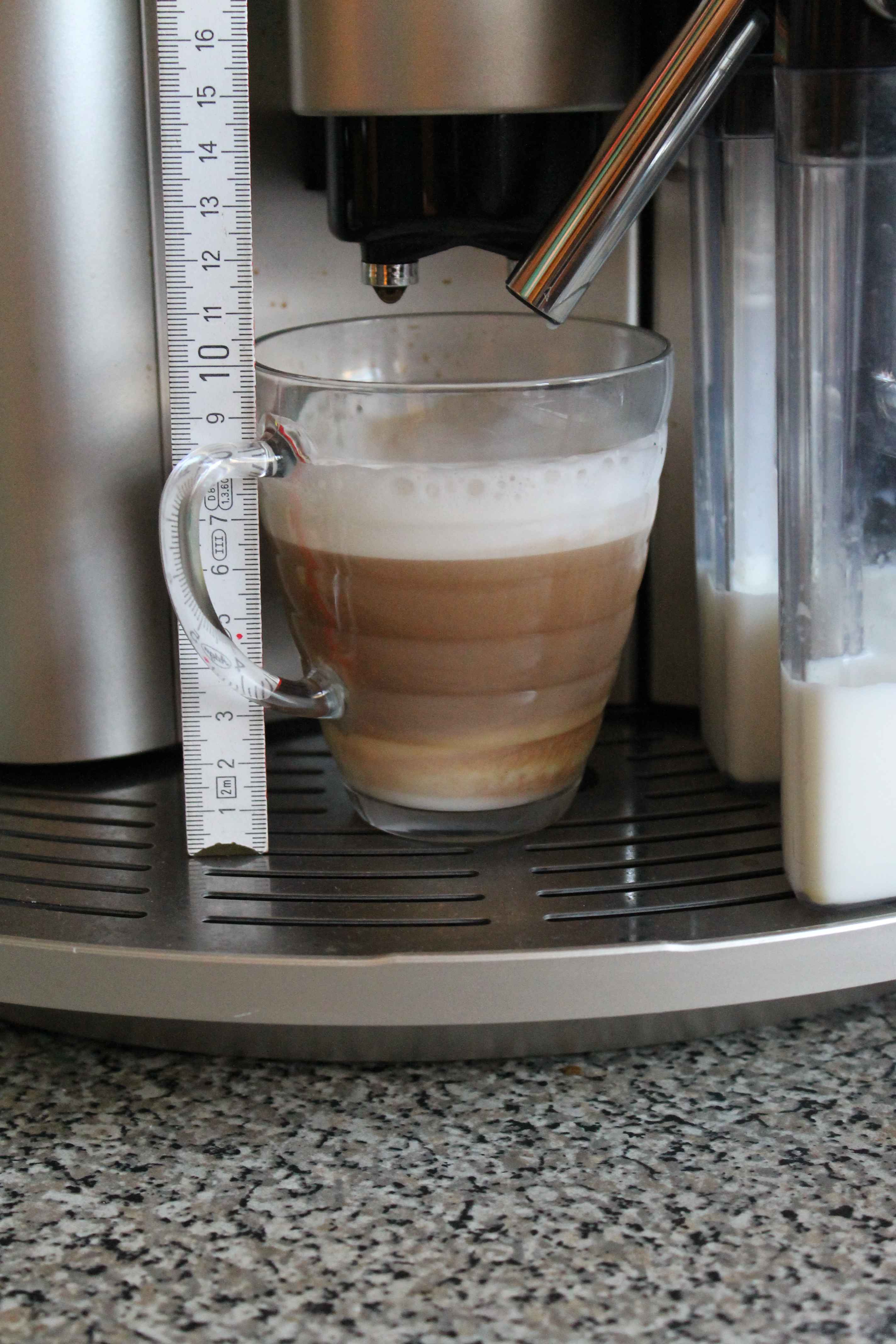 Zum fünften der Milchkaffee in seiner vollen Pracht nach zwei Minuten! Früher hat der Milchschaum immer oben zum Glas rausgeschaut...