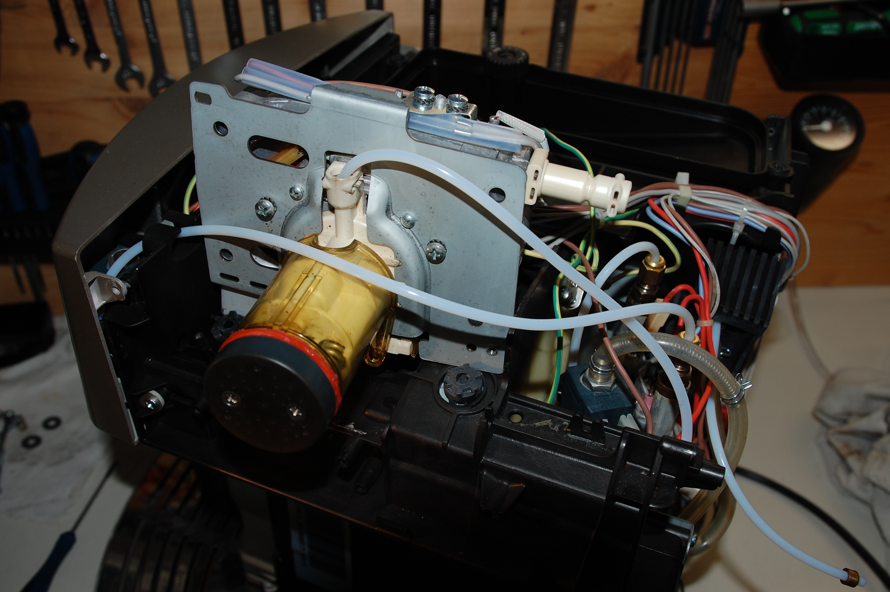 meine Prima Donna läuft aus und ich weiß jetzt auch wo... und zwar unter dem Thermoblock geht ein dünner Schlauch in ein breites weißes Kunststoffteil (sorry wenn ich nicht die Teile richtig benennen kann, denn 1. bin ich weiblich und blond und 2. habe ich mir erst seit ein paar Tagen eingelesen), ich denke dort ist eine Dichtung defekt.