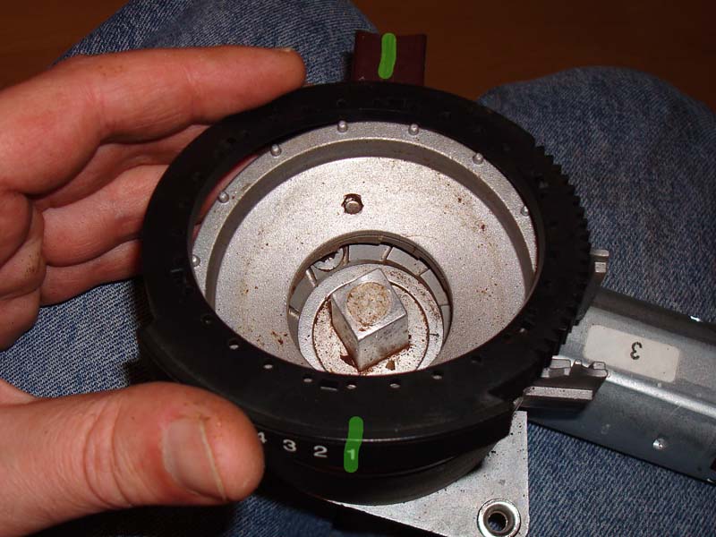 • In der "um 4 Punkte" geöffneten Position clipsen wir nun den Einstellring auf, so daß die 1 gegenüber dem Pulverauslauf ist.