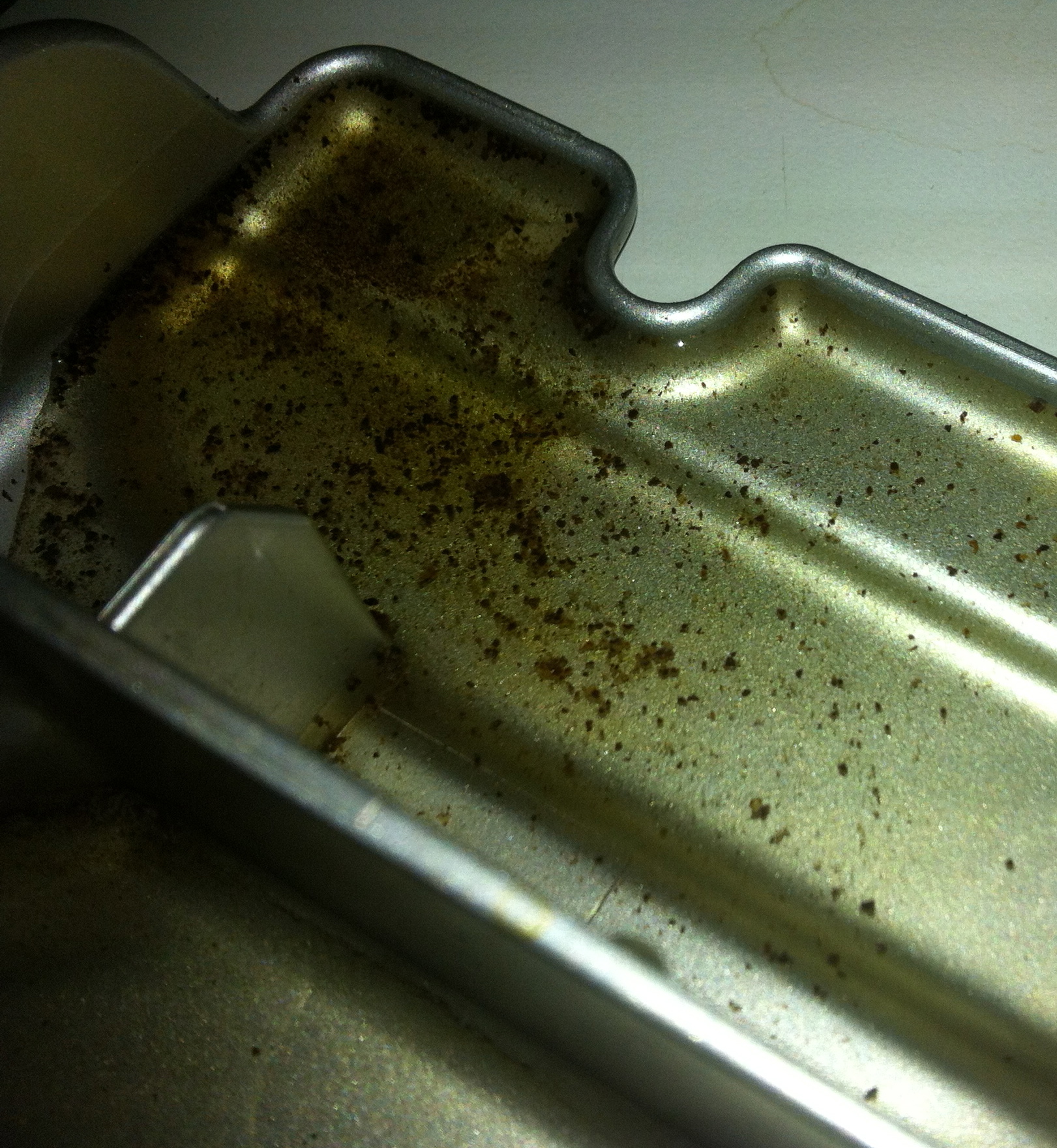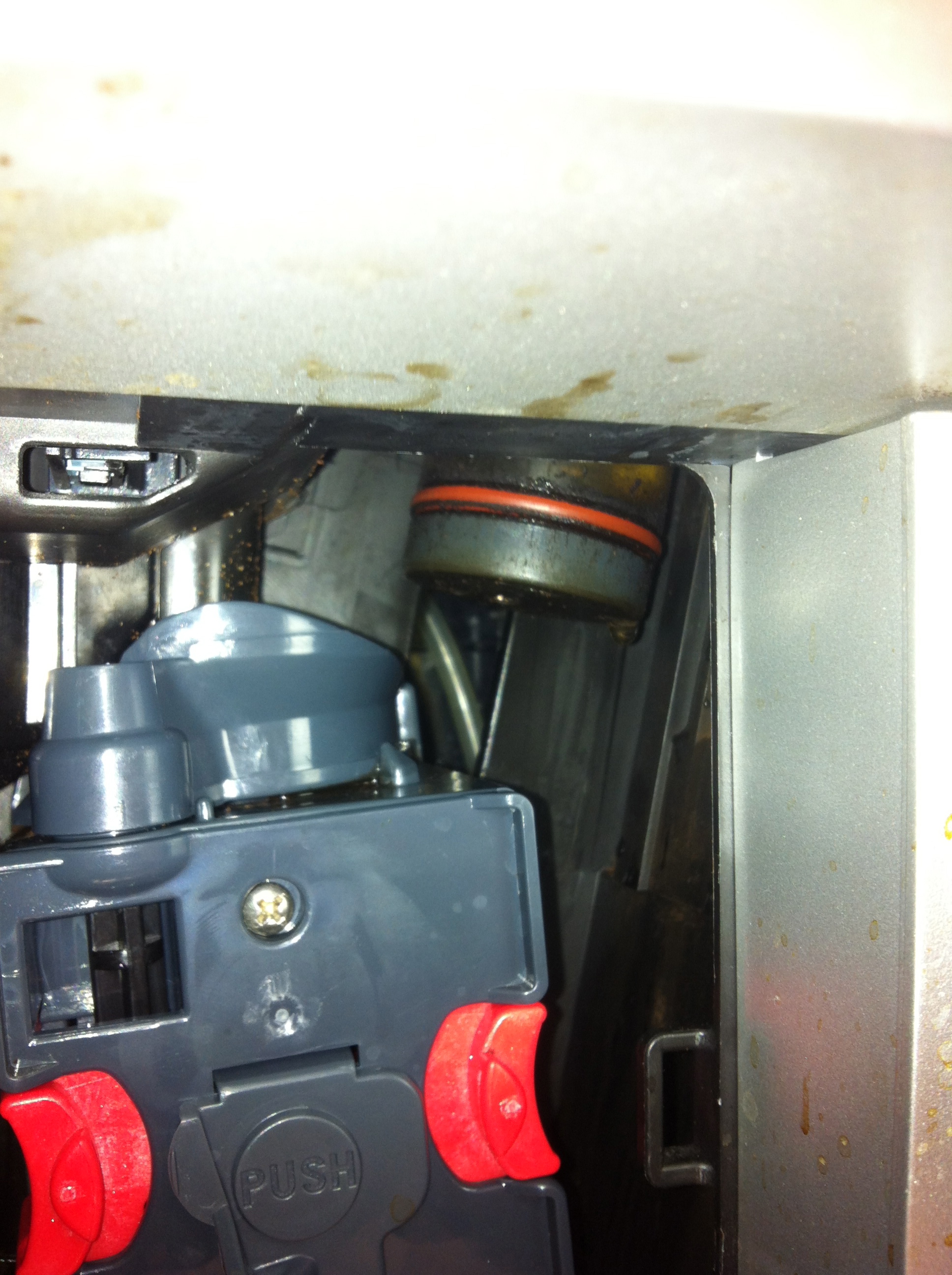 Wasser unter der Brüheinheit. Man sieht es tropft unten rechts an der Brüheinheit weiter und aus der Rinne rechts tropft es (ist aber
