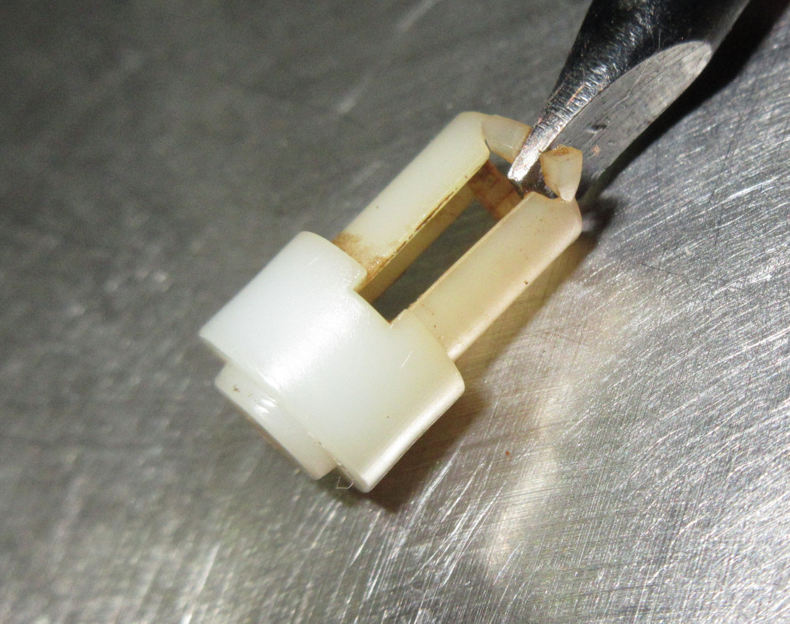 Das Blöde an der Kappe ist nun, dass irgendwann die Führung, die den Stift aufnimmt, einreißt. Ist einfach eine Frage der Alterung; bei mir wars nach 13 Jahren der Fall. Dadurch sind Stift und Kappe nicht mehr fest verbunden, so dass die Kappe beim Zurückfahren in die Grundstellung den Stift nicht mehr vollständig mitzieht. Der bleibt dann irgendwo stehen mit der Folge, dass das Ventil offen bleibt. Das Foto zeigt bei näherem Hinsehen diese Situation. Eigentlich müsste der Stift vollkommen in die Kappe eingefahren sein. Wie man an dem Schlitz in der Führung sehen kann, ist er das aber nicht, sondern nur ca. zur Hälfte. Obwohl also das Ventil in Grundstellung zu stehen scheint, also geschlossen sein müsste, ist es tatsächlich offen.