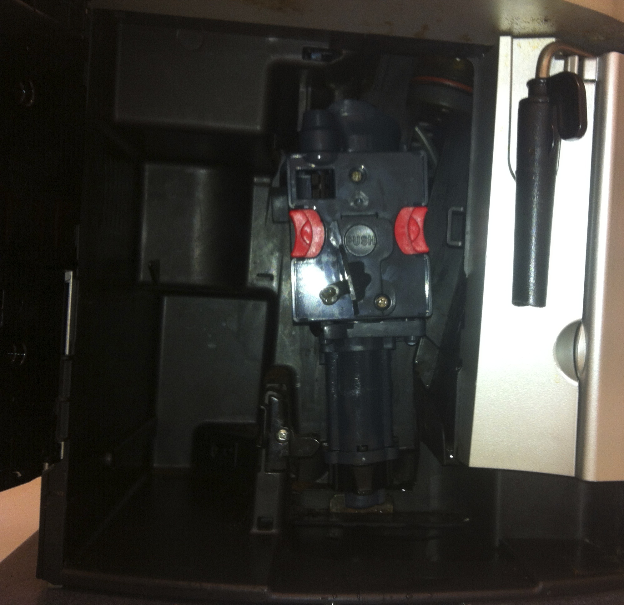 In Bild 1764 ist der Kaffeeausfluss zu sehen (Kaffeemenge min) und rechts unten an der Kante oder der Schraube unten an der Brüheinheit (nicht