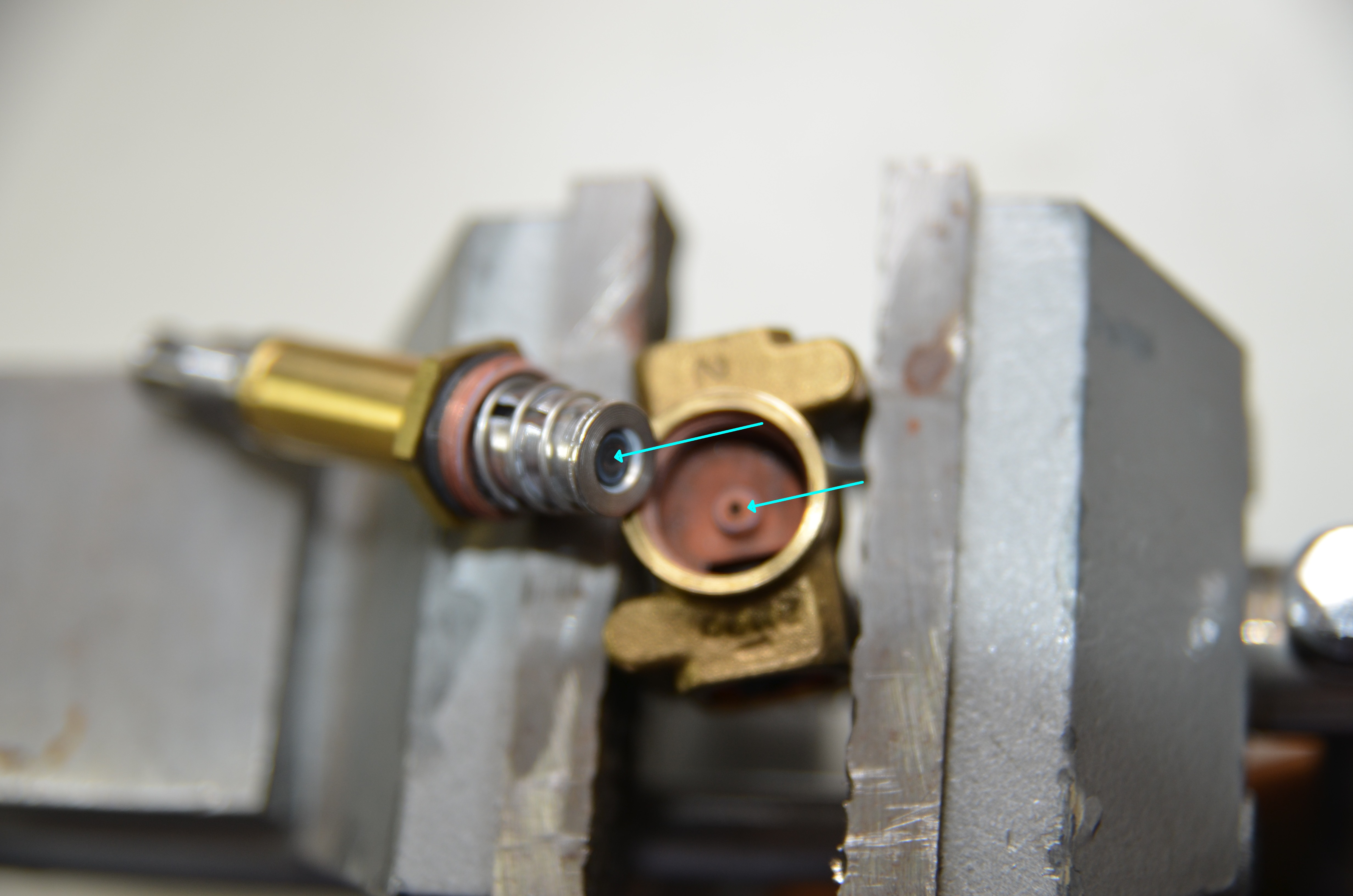 Auf dem ersten Bild sieht man das das obere Teil durchgängig ist (lila Pfeil) Tut also nichts zur Sache. Da kann es nur an der Pressung undicht werden. Das Teil mit dem gelben Pfeil meinte ich mit "Überdruckablassteil".
